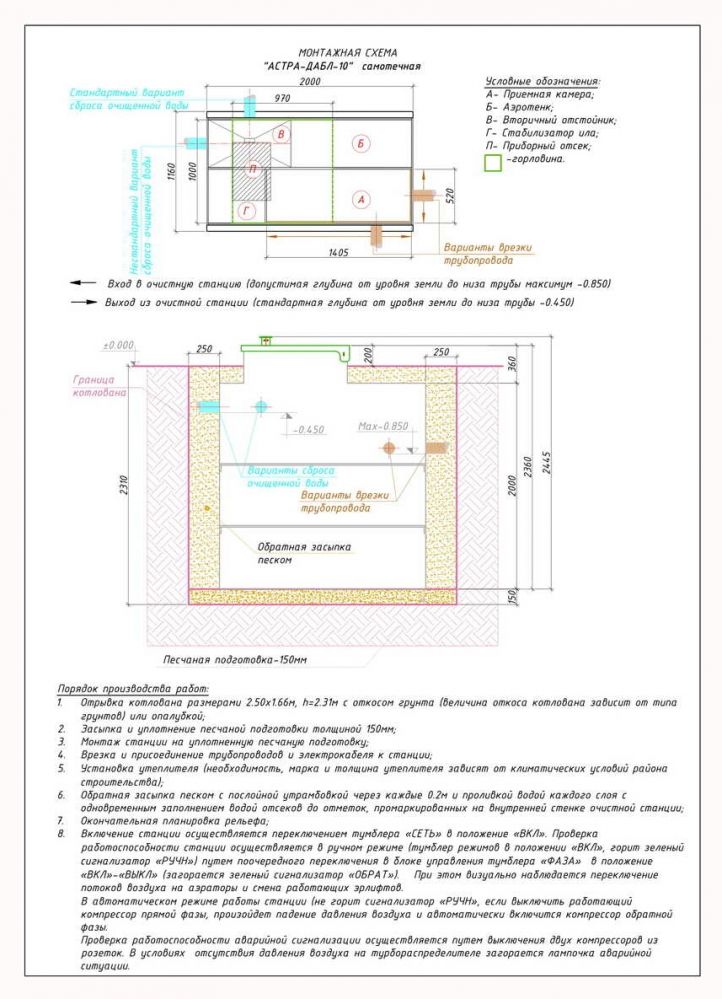 Септик Астра 10 производится так, что все его фильтры очистки располагаются внутри прочного корпуса. Система размещается под поверхностью земли на территории со зданием, которое будет ею обслуживаться. Корпус установки разделяется на четыре отсека: приёмный, отстойник, аэротенк и дренажная система.