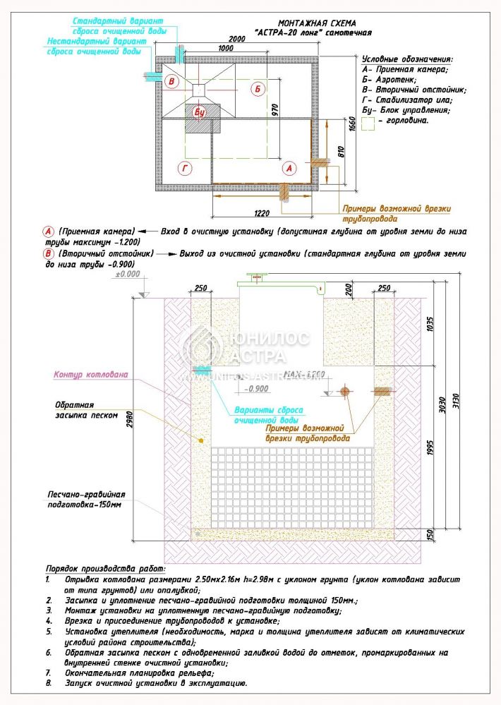 В сутки септик Астра 20 Лонг способен перерабатывать 4 м3 воды, а расход электричества составляет 3.7 кВт за 24 часа. Общая масса равняется 380 кг. Установка возможна только в присутствии нескольких человек. Монтаж следует осуществлять только том в случае, если вы знакомы с алгоритмом.