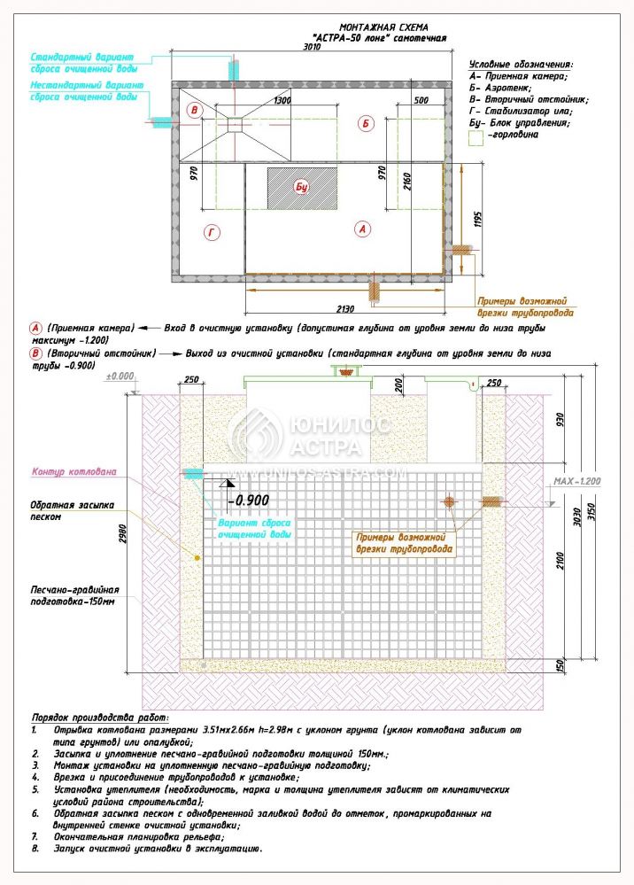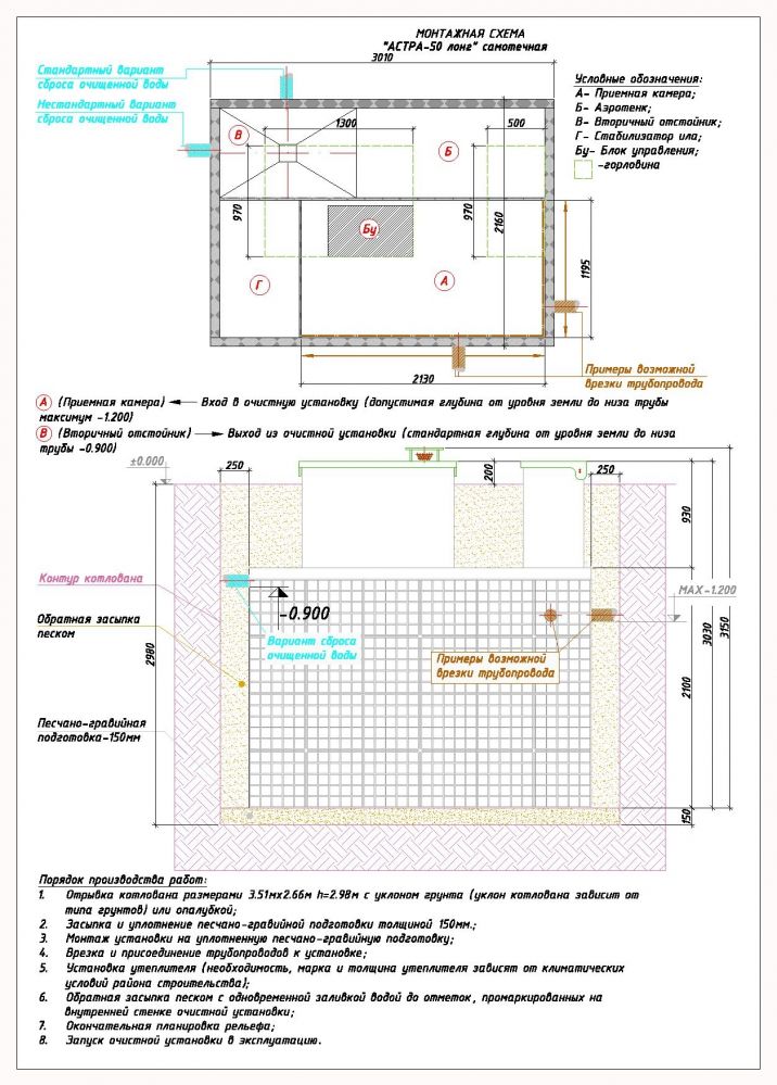 В сутки септик Астра 50 long способен перерабатывать 10 м3 воды, а расход электричества составляет 7.3 кВт за 24 часа. Общая масса равняется 380 кг. Установка возможна только в присутствии нескольких человек. Монтаж следует осуществлять только том в случае, если вы знакомы с алгоритмом.